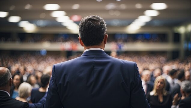 Engaging speaker presenting at a podium with a blank presentation screen, perfect for business announcements or educational lectures with customizable content