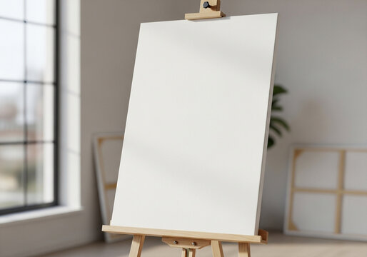 Mockup of a blank white canvas on a wooden easel in a bright artist's studio. A perfect template for showcasing paintings, artwork, designs, or announcements.