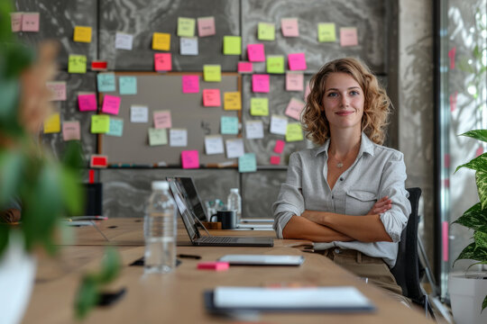 a Caucasian businesswoman leading a workshop on branding strategies for startups in a contemporary boardroom
