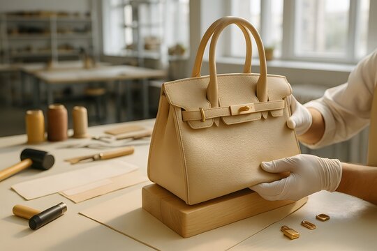 Artisan stretching beige leather over wooden mold in luxury workshop, AI generated