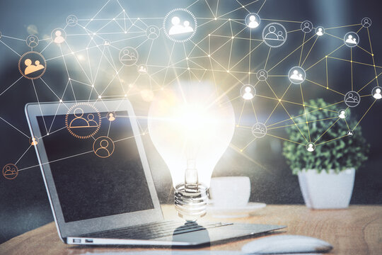 Computer on desktop with social network theme icon. Multi exposure. Concept of international connections.