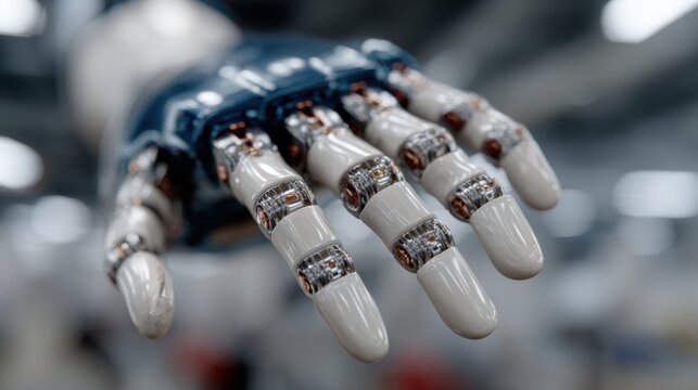 A close-up of a sophisticated robotic hand showcasing advanced technology and intricate design, suitable for illustrating topics like robotics, engineering, automation, and future innovations,