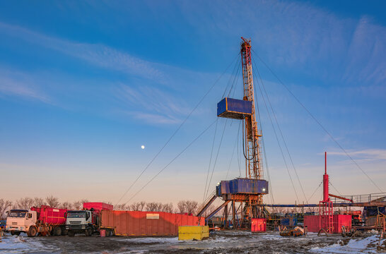 Industrial winter landscape featuring an operational drilling rig with support facilities at a remote worksite during daylight hours