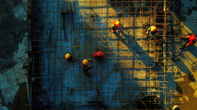 Construction Workers Collaborating on Building Site at Sunset. Concept of teamwork, construction industry, and urban development. Top view