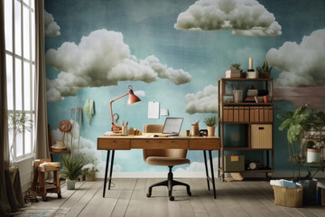 Elevate your workspace with the imaginative concept of a home office, complete with a dreamy cloud filled room. Ai generated