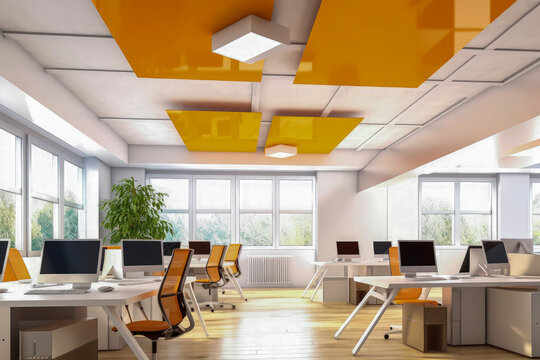 Generative AI illustration of interior design of modern workspace with stylish ceiling and tables with chairs and potted plants indoor