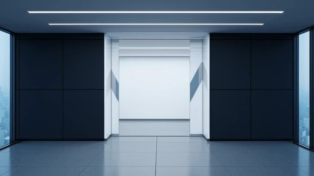 Futuristic home office setup featuring a transparent display screen and ergonomic furniture in a minimalist high-tech interior design