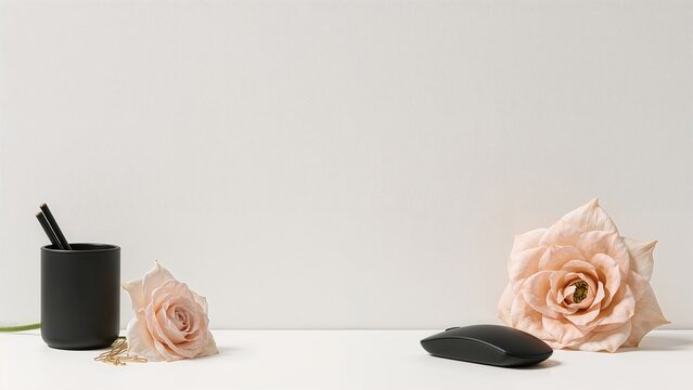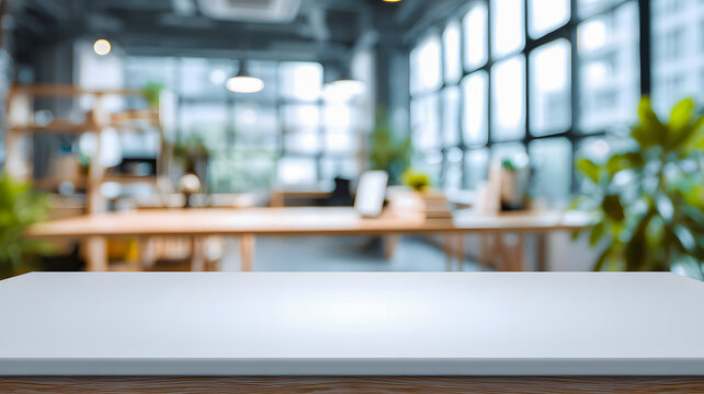 Modern workspace displays a foreground table against a bright blurred background in a stylish office setting