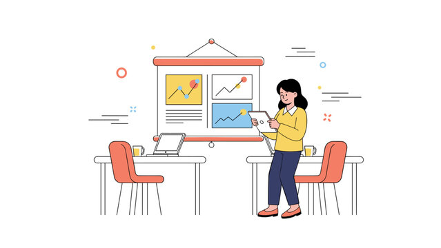 Modern office conference room with city view. Empty meeting room with large windows cityscape. Wooden table, black chairs. Digital display shows business graph. Pro, virtual office setting. Suitable