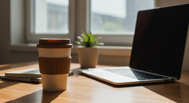 Scandinavian workspace with ergonomic seating and earthy tones. Potted greenery and wood textures define functional minimalist design. Home Decor.