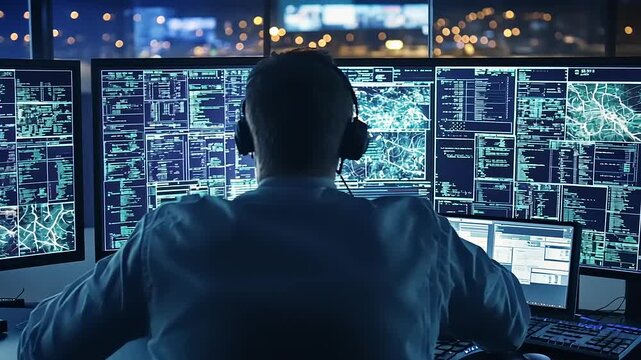A focused operator analyzes data on multiple screens in a high-tech control room at night