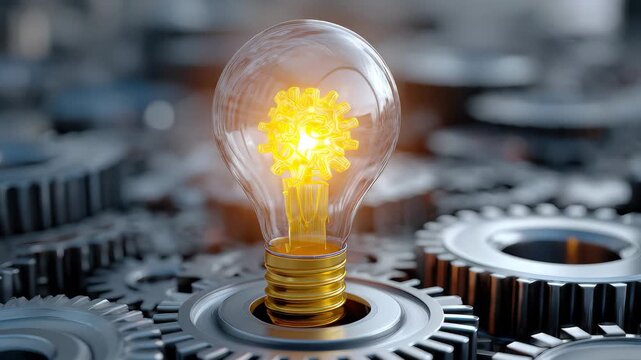 Lightbulb and gears symbolize innovation and ideas in a creative workspace environment, showcasing the fusion of technology and imagination for future solutions