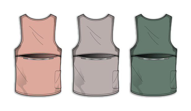 Technical flat illustration of a sleeveless utility vest with pockets. Three modern color options presented for clothing design and product mockups
