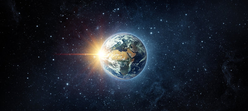 Panoramic view of the Earth, sun, star and galaxy. Sunrise over planet Earth, view from space. Elements of this image furnished by NASA