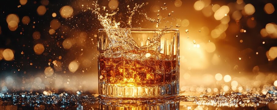 World whiskey day with beverage and glass idea. Glass of whiskey splashing with bokeh background.