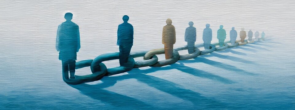 Broken chain with fading human silhouettes in muted tones, spacious layout for World Day Against Trafficking in Persons