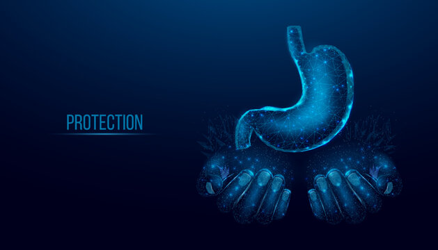 Two human hands are holds human stomach. Concept for medical, treatment of the digestive system.  Abstract modern 3d vector illustration on dark blue background.