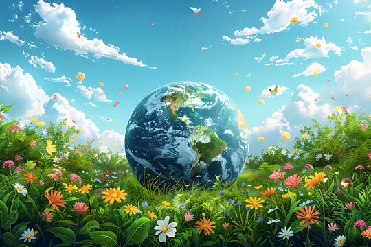 Illustration of Planet Earth with the text "WORLD EARTH DAY" and decorative elements, celebrating environmental awareness.