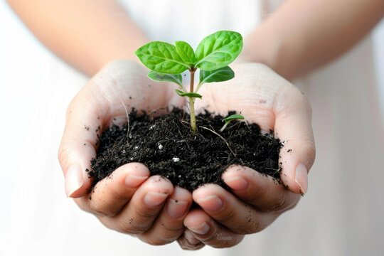 Plant in hands, young sprout, new plant growing in soil, organic farming, environment care, earth day