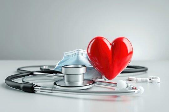 World health day concept Healthcare medical insurance with red heart  stethoscope  mask and medicine
