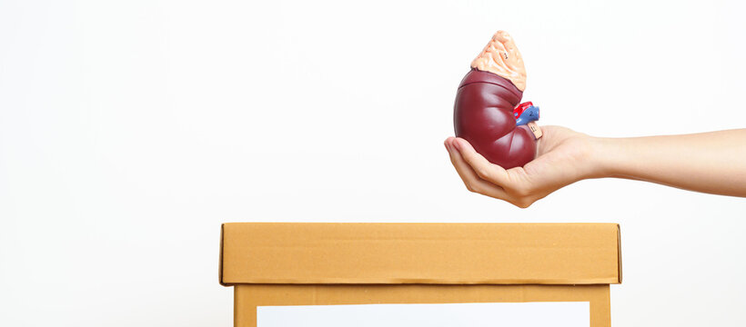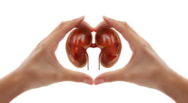 Two hands making a heart shape with a realistic human kidneys in white background. Wallpaper photo background for World Kidney Day celebration, healthy campaign, studying medic, human anatomy, biology
