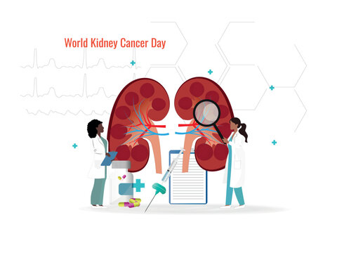 Male doctor showing a model of human kidney using magnifying glass. Early diagnosis and treatment.
