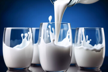 World milk day celebration illustration of fresh milk being poured into some glasses on a gradient blue background generative AI illustration