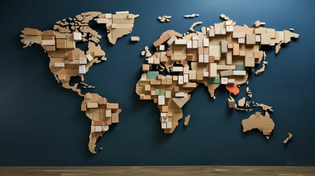 AI generated illustration of a world map made of wooden blocks on a blue wall