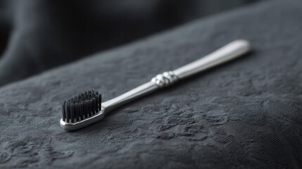 Silver-handled charcoal toothbrush on intricate ebony fabric, embracing eco-luxe dental rituals and World Oral Health Day elegance
