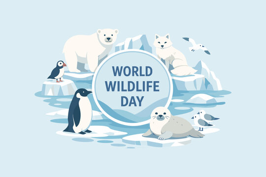 World wildlife day arctic illustration with polar animals and ice landscape. Concept of climate awareness and animal protection