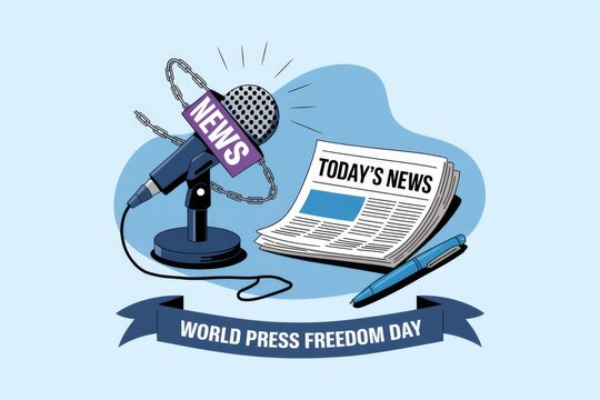 World Press Freedom Day: A microphone, newspaper, and pen symbolize the importance of free press and its role in informing society.
