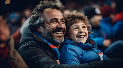 French father and son in stands, filled with enthusiastic supporters of rugby or football team wearing blue clothes to support national sports team