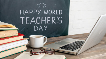 Teacher's day celebration with books, laptop, and chalkboard message. Happy World Teacher's Day setup with coffee, books, and laptop.