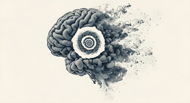 Abstract visualization of the human brain dissolving into smoky ink, centered on a vortex spiral, symbolizing the exploration of complex thought, consciousness, and knowledge on World Philosophy Day.