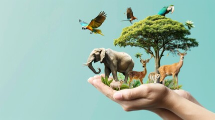 World Animal Day or Wildlife Day concept. Elephant, tiger, deer, parrot and green tree in human hand. Saving planet,
