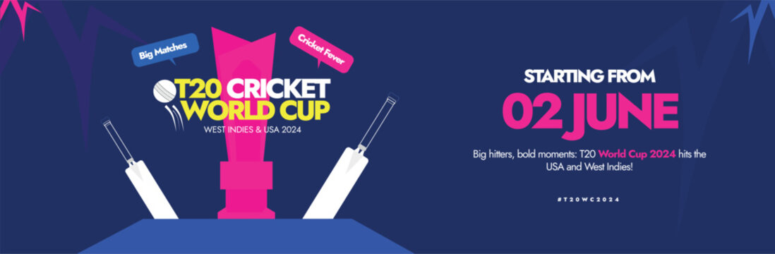 T20 Cricket World Cup 2024. T20 cricket world cup held in America and West indies cover banner with silhouette 2024 trophy, bats, ball . World cup banner with official colour theme.