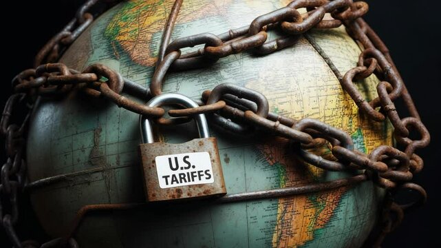 A blue world map made of glowing dots and lines is superimposed over a night scene of a busy harbor with ships and cranes.