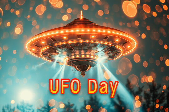 Vibrant illustration celebrating world ufo day with retro futuristic flying saucers over a forest landscape