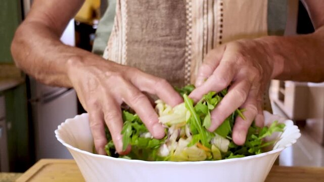 Mature man skillfully mixing fresh greens and vegetables, creating a vibrant vegan salad. Celebrating World Vegetarian Day with healthy, homemade cuisine