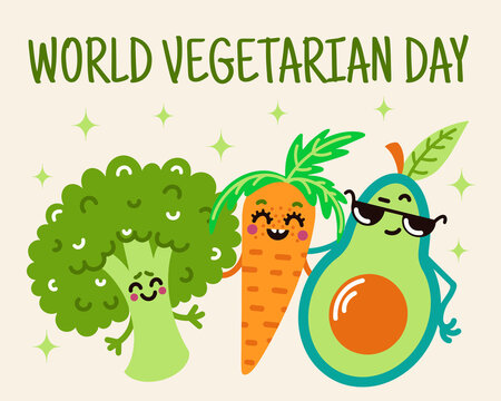 Cute cartoon vegetables vector illustration. Fun broccoli, carrots and avacados celebrate World Vegetarian Day. Hand-drawn harvest. Food sketch. Colored characters in a flat style. Concept with text.