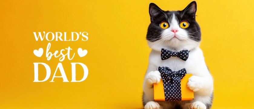 Adorable tuxedo cat holding gift, celebrating Worlds Best Dad