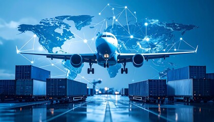 Global logistics system with glowing neon connections showing worldwide trade and distribution