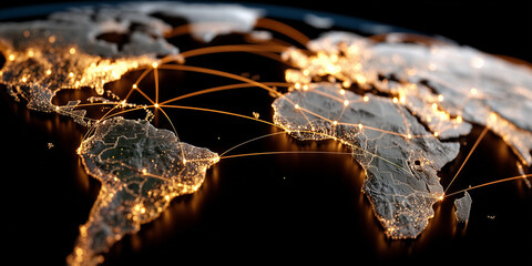 A shiny earth globe illuminated by backlight symbolizes the challenges and opportunities in transitioning from local to global markets, representing growth, expansion, and global connectivity