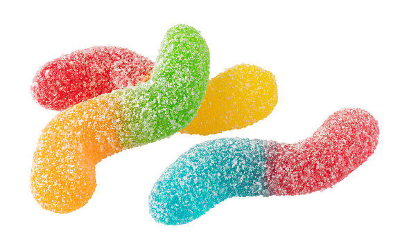 Colorful gummy worms covered in sugar on transparent background