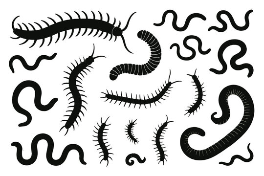 Distinct icon set featuring various centipedes and worms showcasing different styles and shapes in black silhouette on a white background