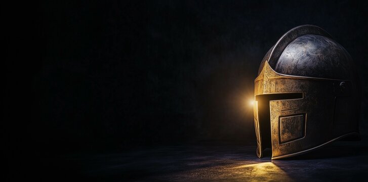 medieval knight worrier helmet with light glowing isolated on dark background with copy space for text
