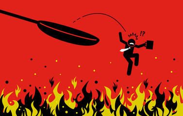 Out of the frying pan and into the fire. Vector artwork concept depicts a businessman making mistake by trying to get out from danger but fell into a far worse situation.