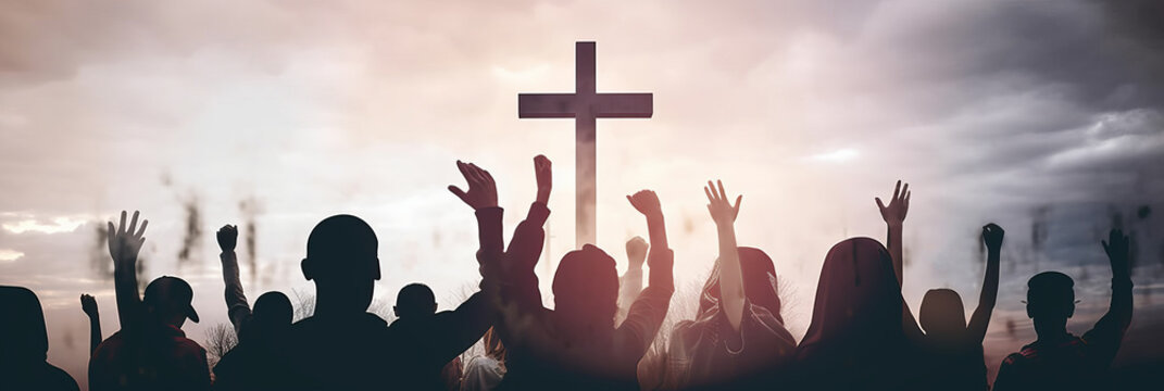 On a cross against a cloudy sky background, a group of Christians raise their hands in worship of God through Jesus Christ. - Generative AI