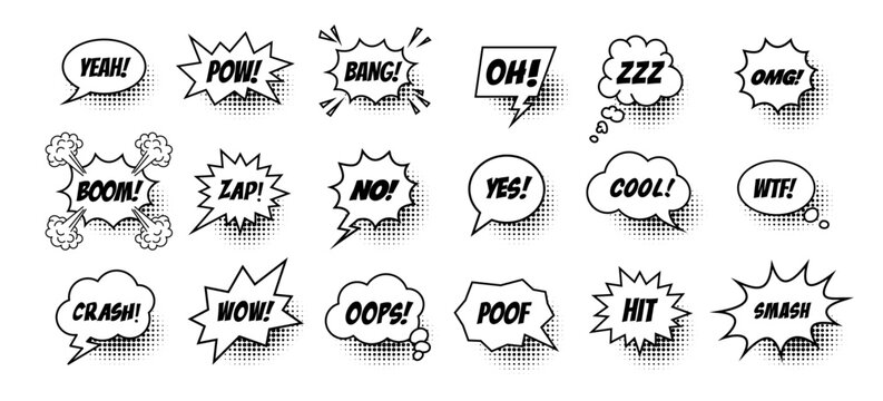 Comic cartoon speech bubble vector set with text: Wow, Bang, Omg, Gtfo, Boom, Yeah, Pow, Zap, Wtf, Yes, No, Oops. Burst stickers, different emotions isolated on white background, halftone black dots