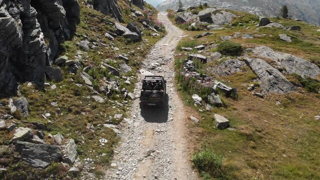 A rugged 4x4 off road vehicle drives down a Rocky Mountain trail - an action zoom sequence for overland and four wheel drive, off-roading content - jeep trail wrangler